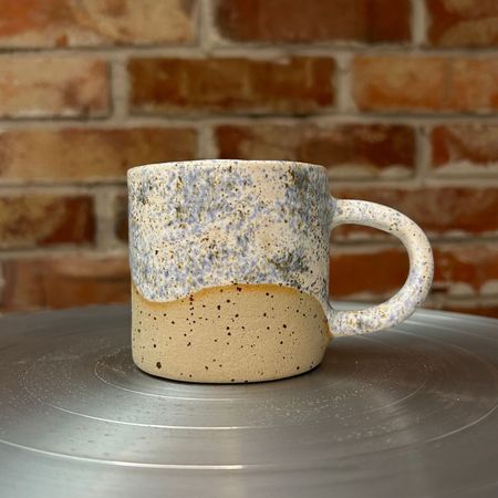 Trochę retro, trochę vintage, trochę morska bryza. Kubeczek w biało-błękitnych odcieniach, z lekkimi przetarciami oraz brązowymi "piegami".